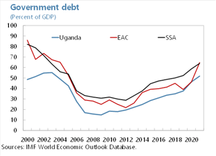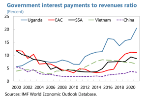 - Second, Uganda is doing rather poorly in terms of revenue collections relative to its peers and the amount of debt that needs to be serviced. As a share of GDP, tax revenue collection is below 15 percent—much lower than the EAC average, much less what is observed in other developing countries. And this shortcoming becomes even more obvious when we compare the ration of interest payments to tax revenues: in Uganda it currently stands at 20 percent, compared to 11 percent on average in the EAC, and 9 percent on average for SSA. When you compare the level of debt in Uganda with other countries, it does not stand out because public debt as a ration stands at around 50 percent, markedly below the 64percent SSA average. But in terms of debt servicing capacity, Uganda clearly is doing less well.