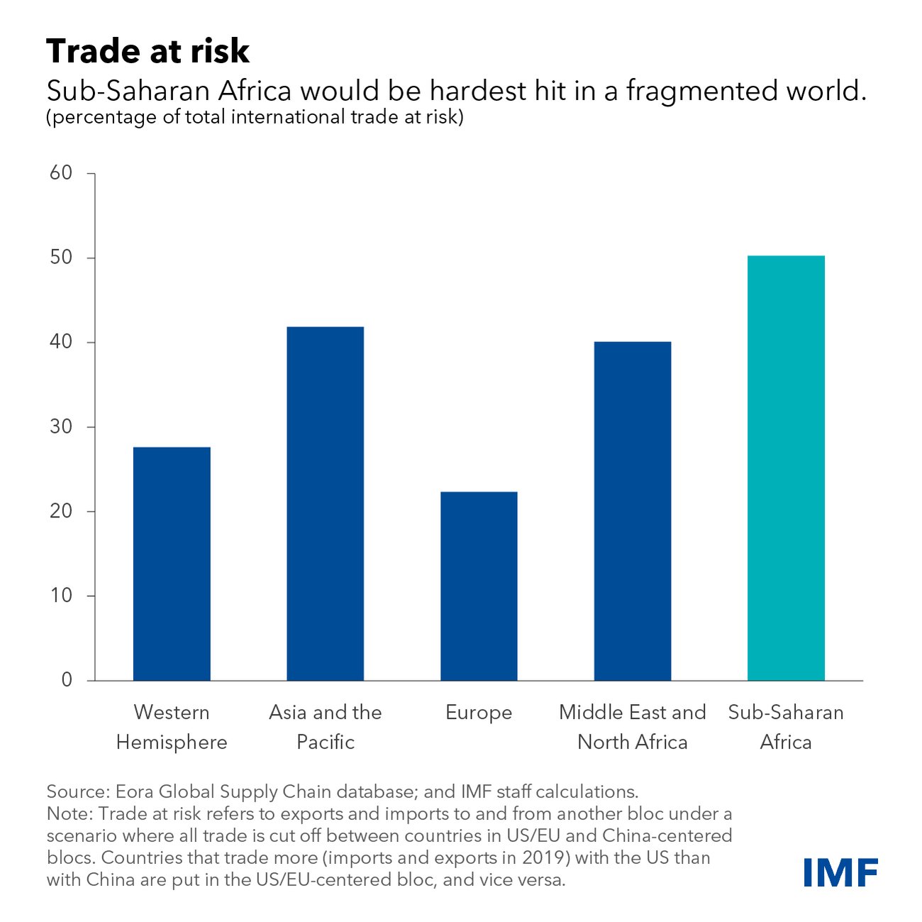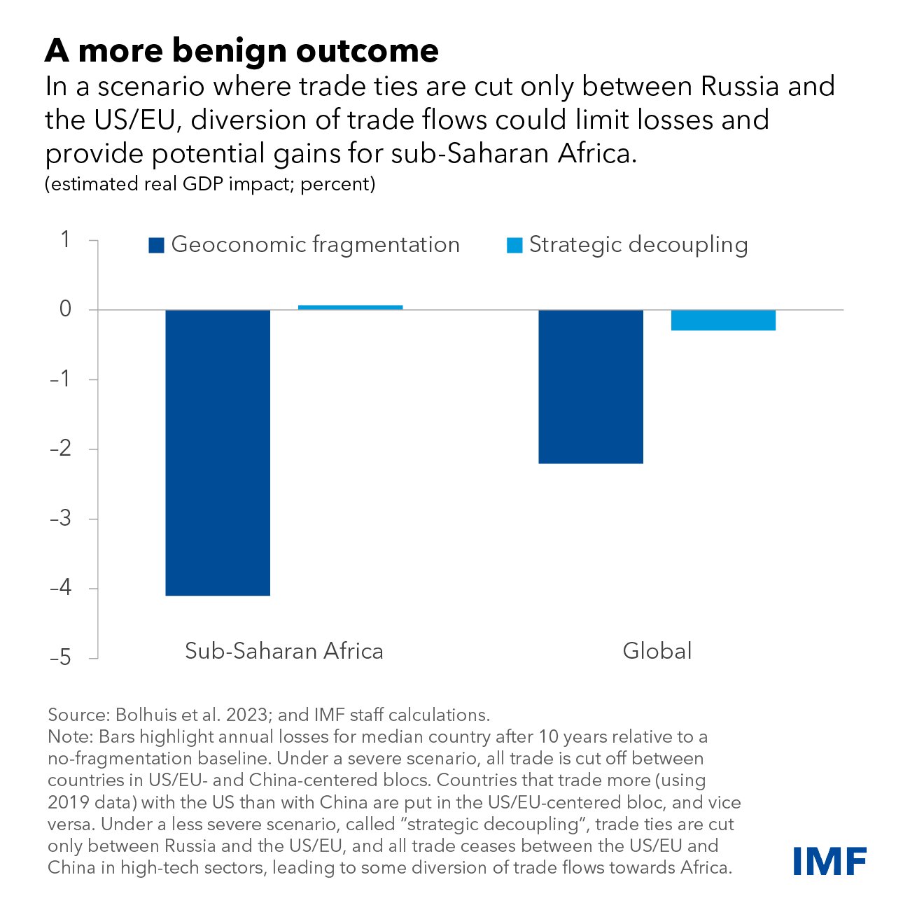 Sub-Saharan Africa could stand to lose the most if the world were split into two isolated trading blocs centered around China or the United States and the European Union. In this severe scenario, sub-Saharan African economies could experience a permanent decline of up to 4 percent of real gross domestic product after 10 years according to our estimates—losses larger than what many countries experienced during the Global Financial Crisis.