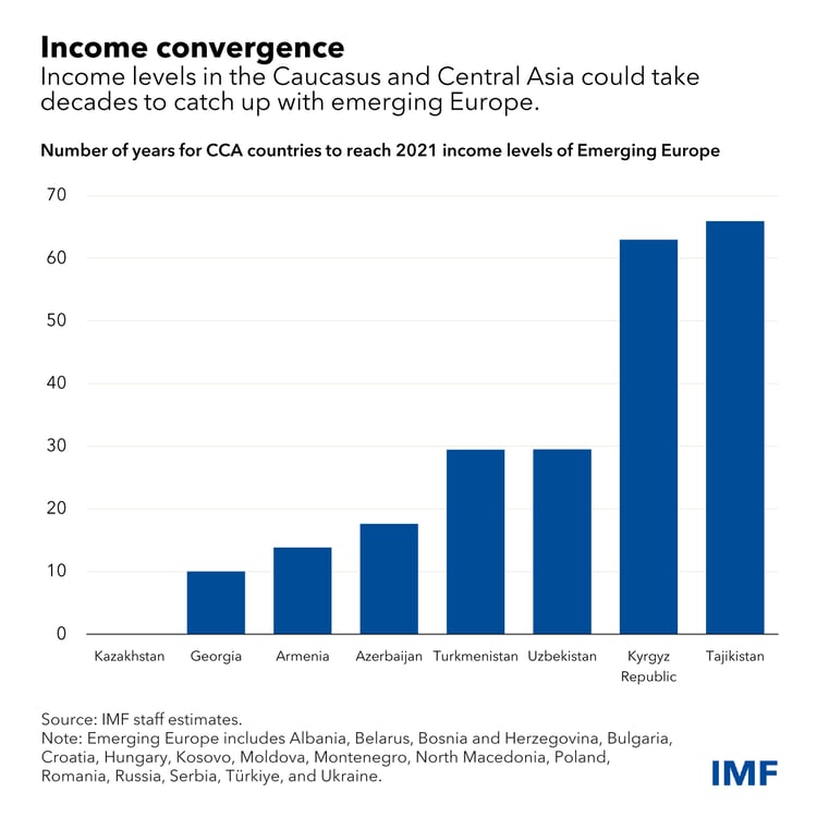 Since independence in the early 1990s, income levels and living standards in the Caucasus and Central Asia (CCA) have improved but remain well below the levels of emerging Europe. The state continues to play a dominant role in many CCA economies and transitions to market economies are still ongoing. The region is now facing risks from global fragmentation due to Russia’s war in Ukraine, which could distort trade and financial flows. Without higher and more inclusive growth, it could take decades for the region to catch up to income levels in emerging Europe—over six decades for Tajikistan and the Kyrgyz Republic, and nearly three decades for Uzbekistan and Turkmenistan.