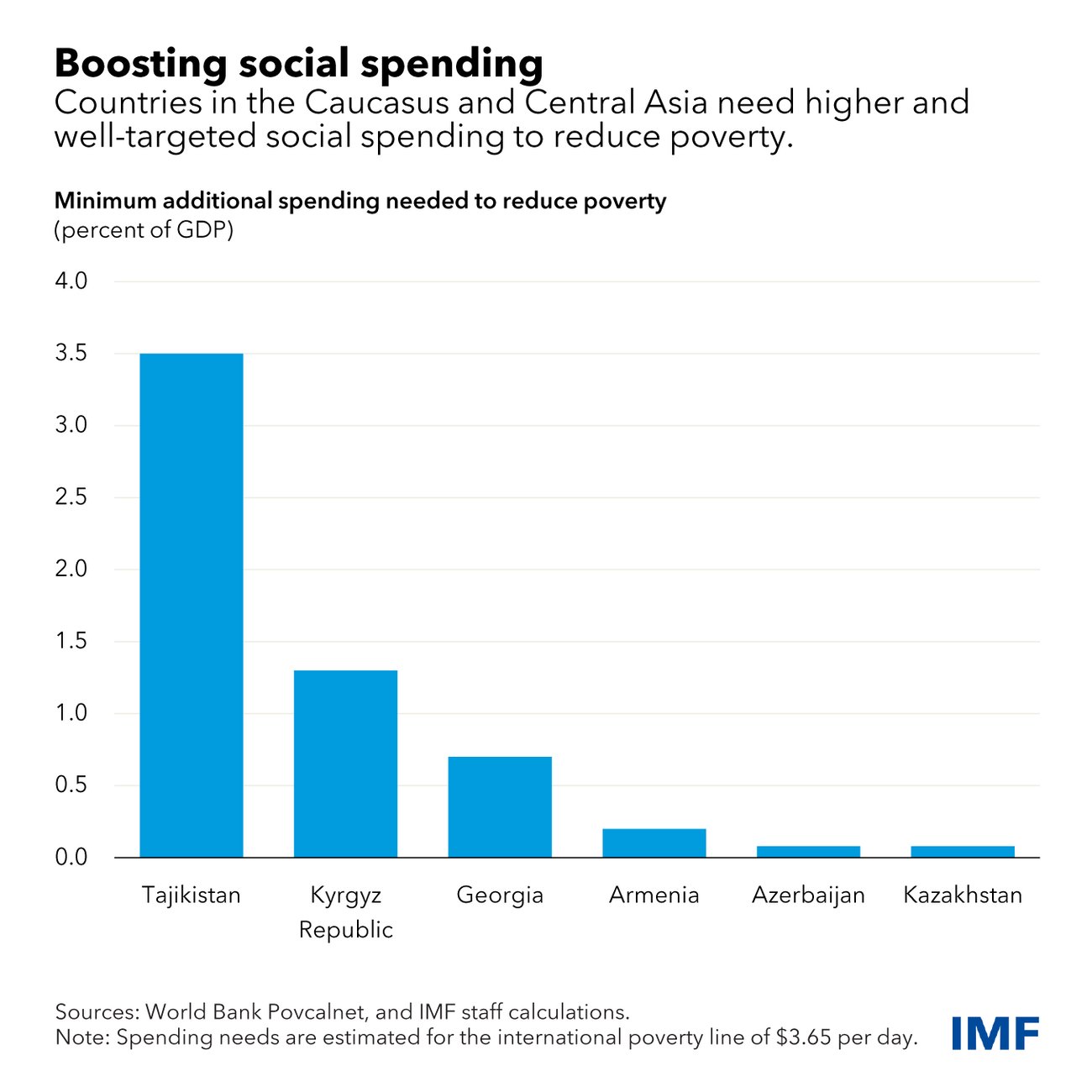 Finally, higher and well-targeted social spending could reduce poverty and improve living standards of the poor. For example, Tajikistan needs to spend an additional 3.5 percent of GDP each year on social safety nets to raise the median income of the poor to the international poverty line of $3.65 per day. Well-designed social safety nets will help protect the most vulnerable from the impact of the reforms needed to reduce the role of the state in the economy and adopt a new growth model.