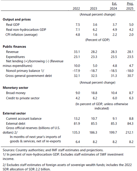 UAE economic growth remains strong, driven by robust domestic activity. Non-hydrocarbon growth has benefitted from healthy tourism flows and increased activity in the construction, manufacturing, and financial services sectors. This more than offset a contraction in hydrocarbon growth from OPEC+ and UAE voluntary oil production cuts, resulting in overall GDP growth of 3.6 percent in 2023. Inflation moderated sharply to 1.6 percent in 2023. Fiscal and external balances remain high, supported by relatively high oil prices.