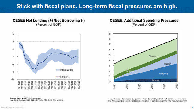 Despite the recovery, fiscal balances have not improved (LHS) and long-term fiscal spending needs remain high [RHS]. They are mostly aging-related (health and pensions), security related (defense) and climate-related.