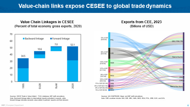 Beyond costs, the CESEE region’s integration into global value-chains and trade linkages create exposure to shifting trade dynamics.