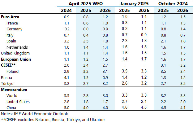 - For the euro area, we forecast growth rates of 0.8 and 1.2 percent for 2025 and 2026. The size of the downgrade relative to our latest forecast in January 2025 is -0.2 percentage points for both years and broad based across countries (Table 1).