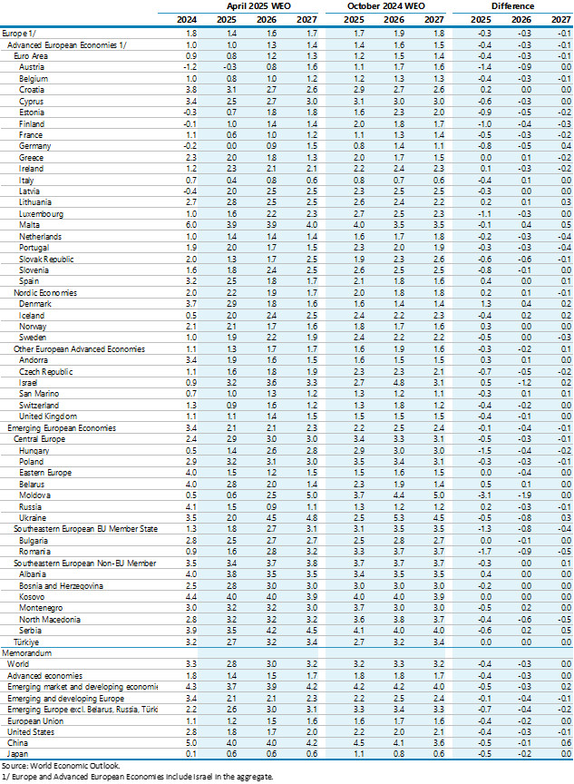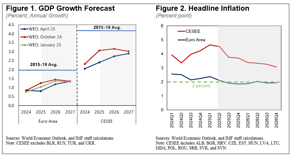 - Growth in the Central, Eastern, and Southeastern European (CESEE) region[2] has been downgraded by more. Our forecast is for 2.6 and 3.0 percent growth in 2025 and 2026 (Figure 1). This sizeable downgrade is primarily due to a comparatively larger trade-exposed manufacturing sector in the region.