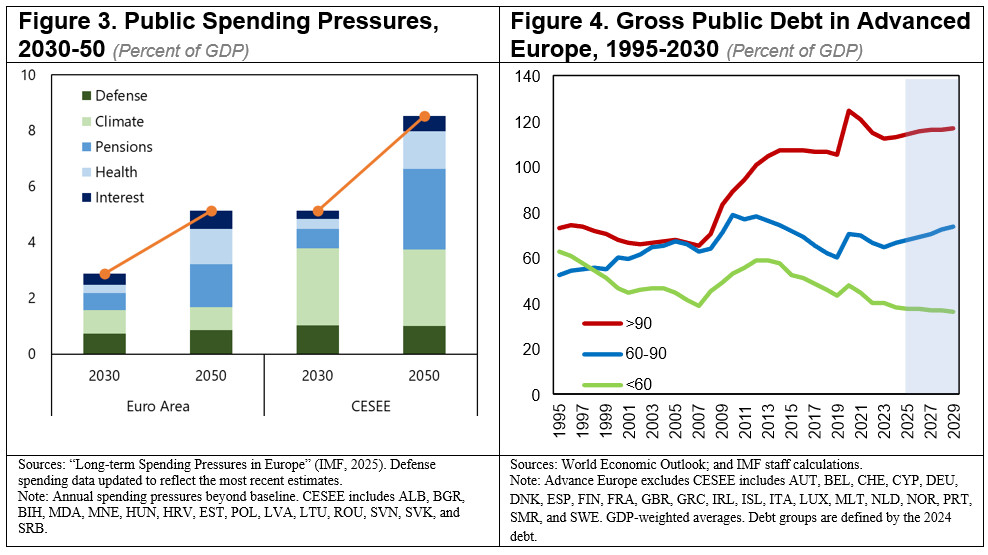 - Over the next 25 years, social, defense, and climate spending alone will add almost 5 ¾ percentage points of GDP to budgets in advanced economies, and 8 percentage points in emerging Europe (Eble et al., 2025).