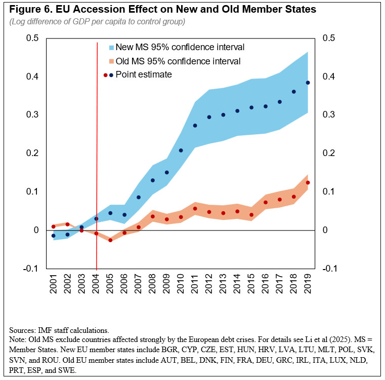 - The potential power of integration is immense (Figure 6) The last enlargement wave in 2004, led new member states to increase their GDP per person by 30 percent after 15 years versus what it would have been without accession (IMF October 2024b).