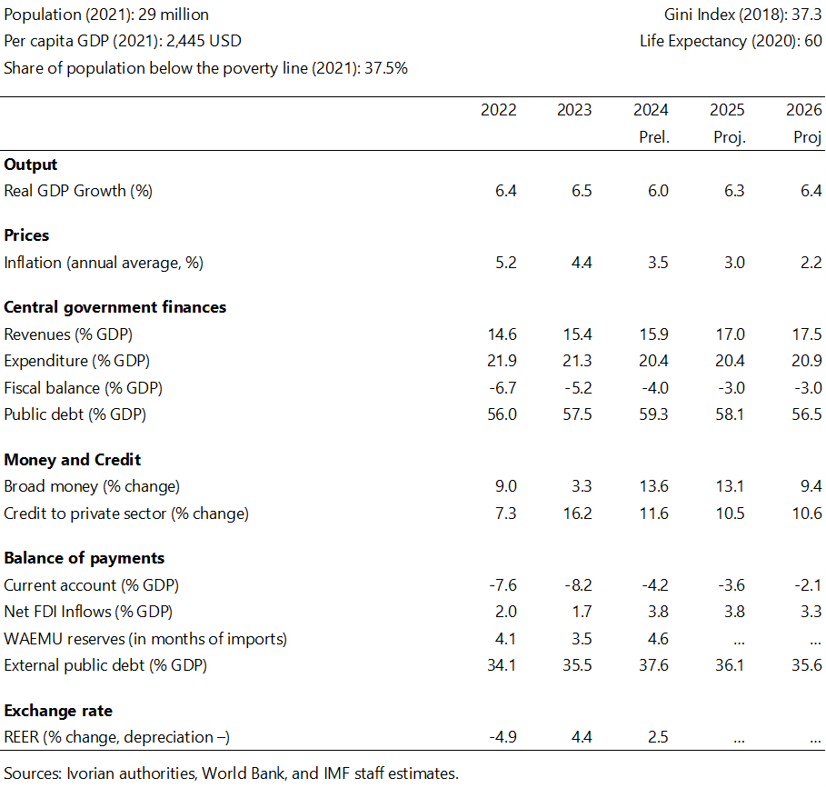 Côte d’Ivoire’s resilient economy has consolidated its role as an anchor of stability in the region against a still difficult global backdrop. Amid a recovery in agricultural production, favorable terms of trade and rising household incomes growth is expected to pick up in the near term. The medium-term outlook also remains favorable as economic fundamentals strengthen further and the hydrocarbon and mining sectors add to broad-based growth. Risks are broadly balanced. For 2025, growth is projected to be 6.3 percent, while average inflation is expected to return to within the 1 to 3 percent WAEMU target range. The 2025 current account deficit is projected to narrow to 3.6 percent of GDP, and the fiscal deficit is expected to meet the WAEMU deficit ceiling of 3 percent of GDP.