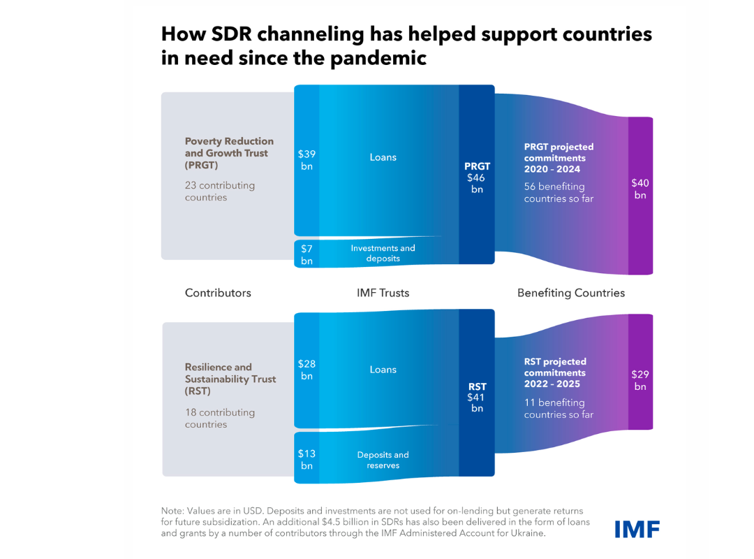 The Chart of the Day shows how voluntary channeling of special drawing rights, the IMF’s unique international reserve asset, benefits countries through two key lending instruments: the Poverty Reduction and Growth Trust and the Resilience and Sustainability Trust.