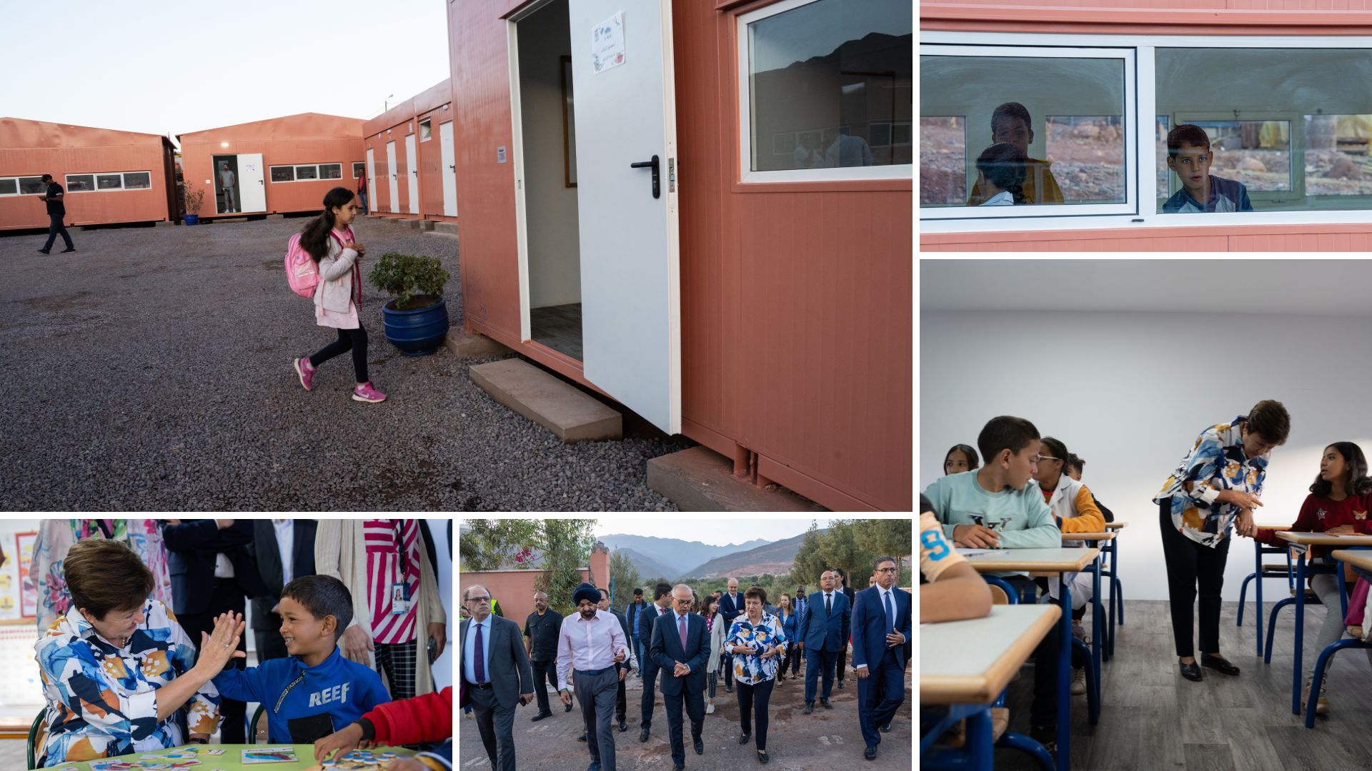 Earlier in the day Georgieva and World Bank President Ajay Banga visited a school in the foothills of the Atlas Mountains that was severely damaged by the earthquake. Morocco’s Minister of Education, Preschooling, and Sports Chekib Benmoussa accompanied them to visit the temporary modular classrooms allowing primary school students to continue with their education.