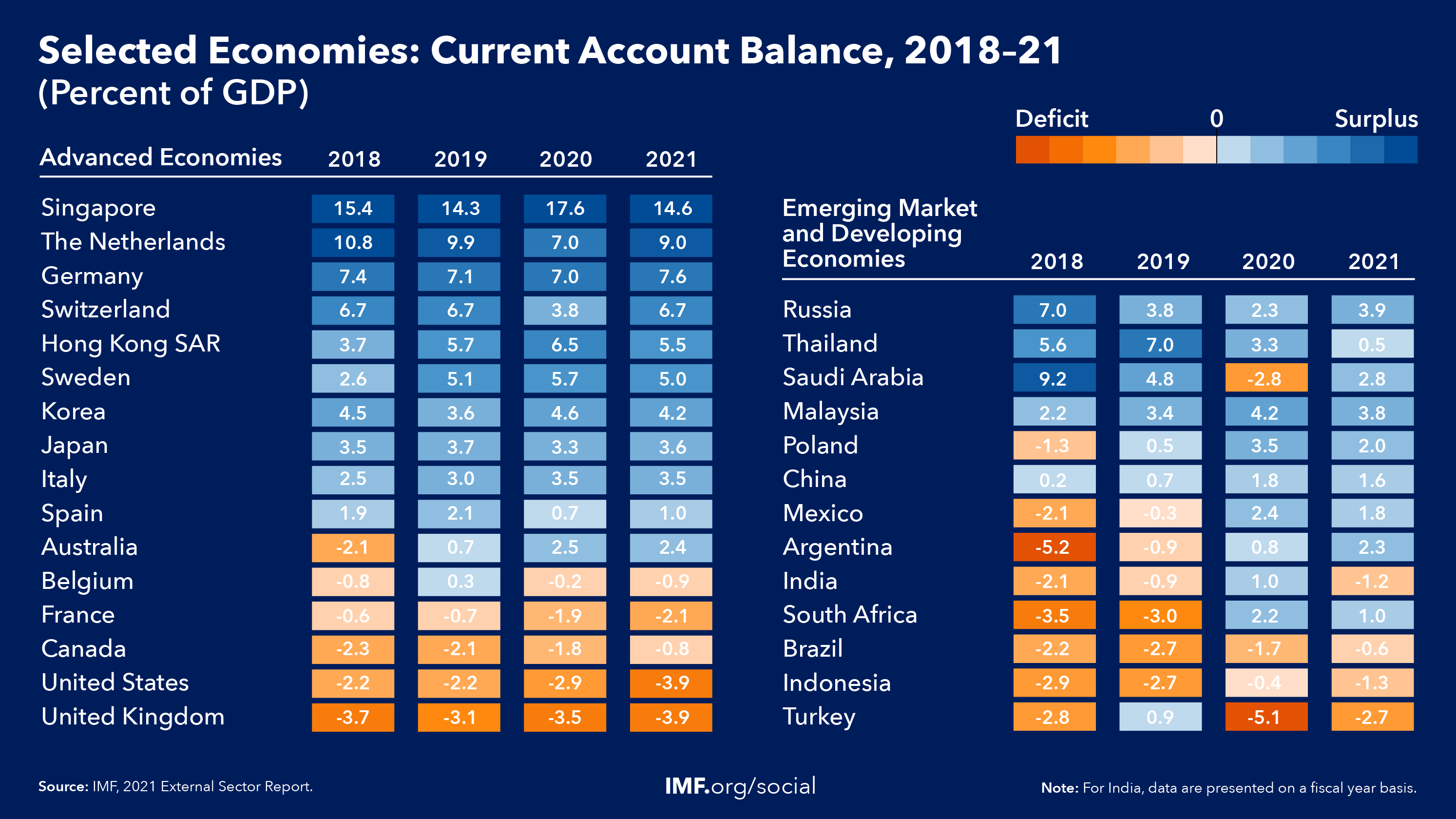 Unprecedented government borrowing to finance health care and economic support has had uneven effects on current account balances. The impact on the current account balances depends on a country’s relative fiscal policy stance compared with that of its trading partners.