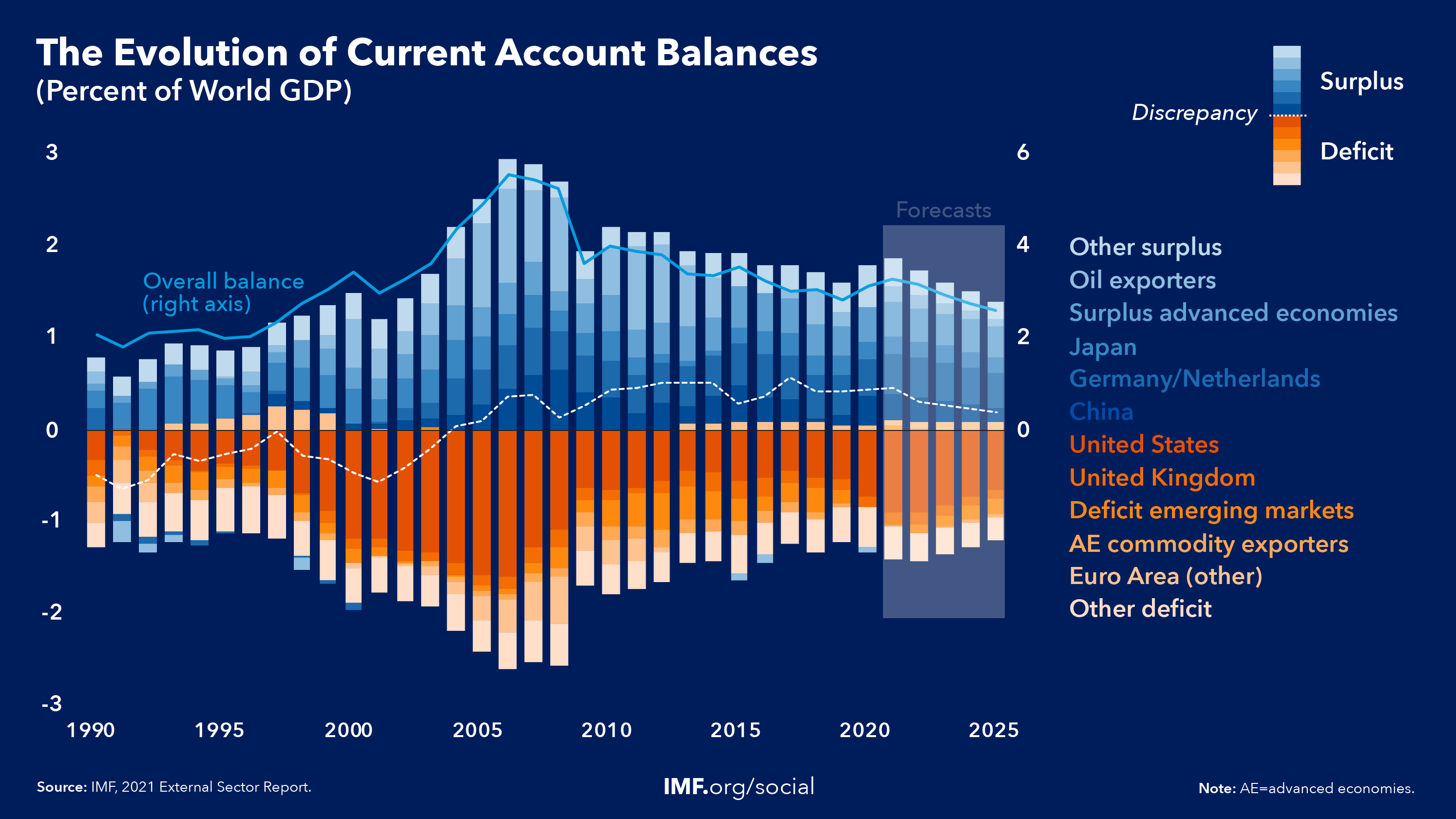 Overall current account deficits and surpluses widened in 2020 to 3.2 percent of world GDP. The IMF’s multilateral approach suggests that global excessive imbalances were broadly unchanged in 2020 at about 1.2 percent of world GDP. The external outlook for 2021 is highly uncertain given the divergent economic prospects across countries.