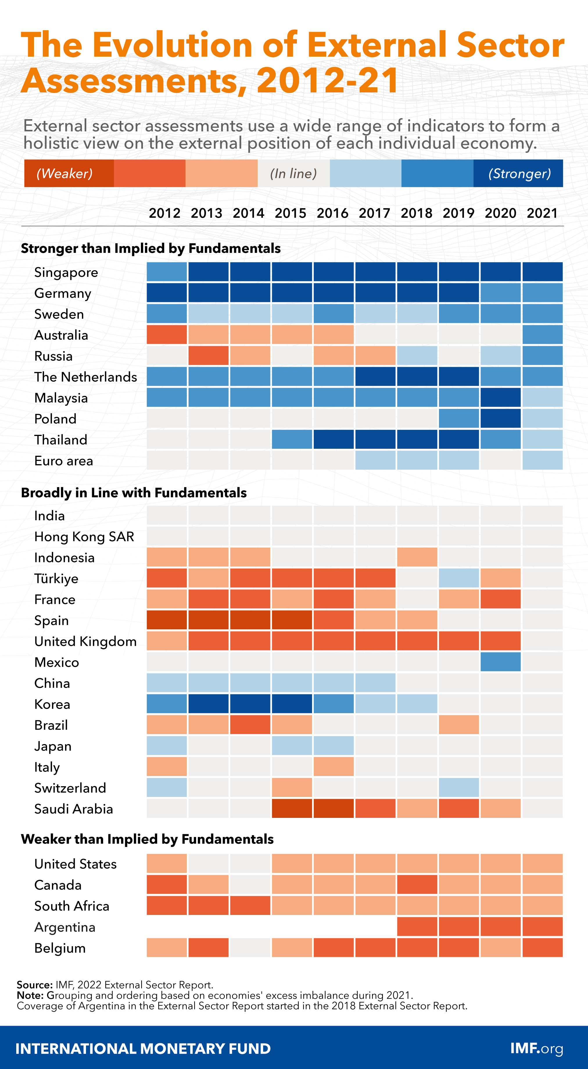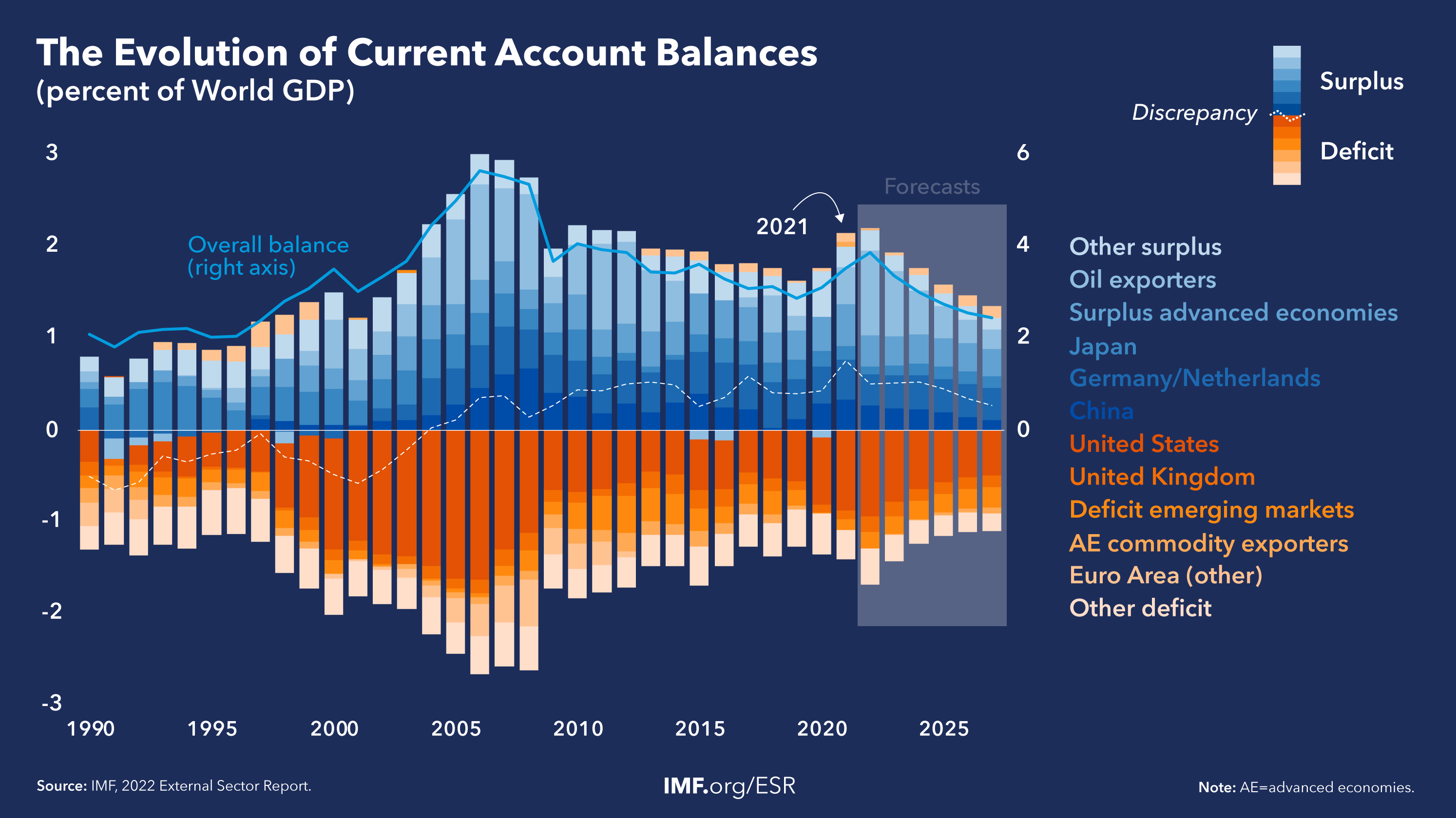 Global current account balances—the overall size of current account deficits and surpluses—continued to widen in 2021 to 3.5 percent of world GDP, and are expected to widen again this year. The IMF’s multilateral approach suggests that global excess balances narrowed to 0.9 percent of world GDP in 2021 compared with 1.2 percent of world GDP in 2020.