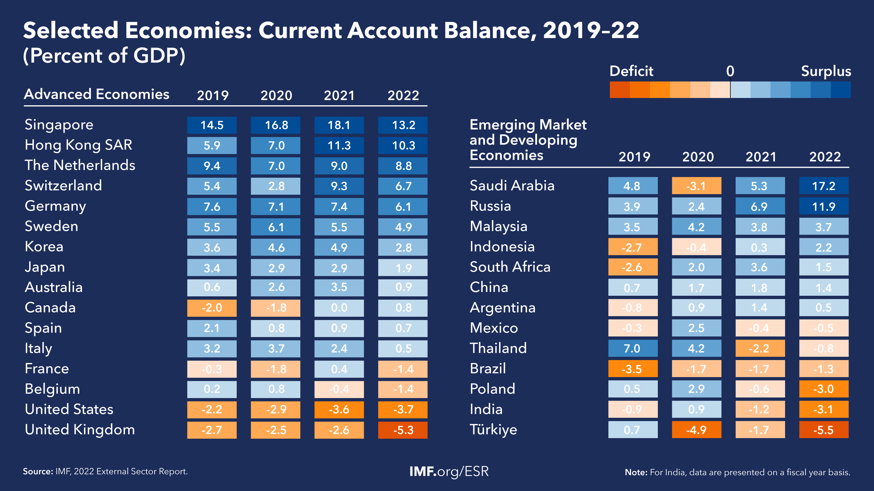The medium-term outlook for global current account balances is a gradual narrowing as the impact of the pandemic fades away, commodity prices normalize, and fiscal consolidation in current account deficit economies progresses. However, this outlook is highly uncertain and subject to several risks. Policies to promote external rebalancing differ with positions and needs of individual economies.