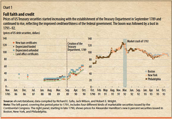 Hamilton’s debt proposal raised a couple of contentious political issues. First, the debt swap would be carried out at face value. This meant windfall gains for many current debt holders who were speculators and had purchased the original securities at a small fraction of their face value—sometimes as little as 20 percent—from the patriots who bought them at issuance. Should not the original creditors be rewarded and financial speculation curbed? Hamilton thought not: the original holders sold voluntarily, obtaining needed cash and showing little faith in the creditworthiness of the US government. Retroactive government intervention in a private financial transaction would be inappropriate. Public credit was founded on the government’s willingness to honor the terms of financial contracts. On that foundation, the US financial system would be built. Credibility was gained rapidly after the passage of Hamilton’s proposals. In 1791, prices rose above par before falling again during the financial crisis of 1792 (see Chart 1).