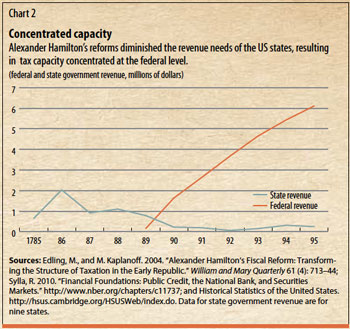 Hamilton was motivated by several additional considerations. Politically, he sought to ensure the allegiance of creditors to the federal government; institutionally, he wanted to foster deep and liquid markets for Treasury securities. A further political motivation was related to the fundamental matter of assigning taxation across levels of government. There were two issues to consider: first, the Constitution gave the federal government the exclusive right to levy tariffs. Overlapping authority for other instruments of taxation opened the door for tax competition among the states. Second, the federal government would assume states’ debt and therefore the interest payments that comprised the biggest expenditures in most states. In this way, the federal government would diminish the revenue needs of the states, with the result that the ability to tax would be concentrated at the federal level (see Chart 2). Hamilton proposed to shape the structure of government through the structure of the public finances.
