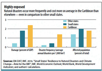 The Caribbean’s vulnerability is characteristic of small island states, but this region has typically suffered more damage than others. Average estimated disaster damage as a ratio to GDP was 4.5 times greater for small states than for larger ones, but six times higher for countries in the Caribbean. Moreover, the region is seven times more likely to be hit by natural disasters than larger states and twice as likely as other small states (see chart).