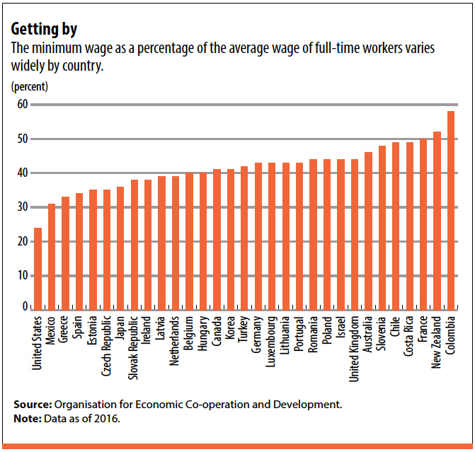 Almost every country has a minimum wage. The details vary: some countries, such as France, fix a universal minimum across the economy, while others, such as New Zealand and South Africa, differentiate between sectors and types of workers. Typically, the minimum wage is set by the government and revised periodically in consultation with business and labor organizations (see chart).