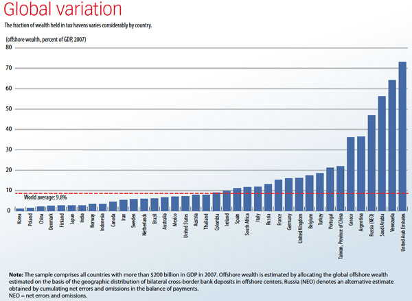 The figures vary dramatically, from just a small percentage of GDP in Scandinavia to as much as 60 percent in Russia, the Gulf states, and Latin America. Interestingly, they found connections between offshore wealth and the presence of natural resources, a history of political instability, and proximity to Switzerland.