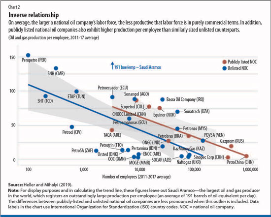 Our data provide clues for mapping the roles different companies play and how well they achieve their various objectives. Building on earlier work by Nadejda Victor (2007), Chart 2 shows the productivity of labor in production terms (production per employee) and total employment figures (logged) for the NOCs in our sample for which data are available. On average, the larger the labor force, the less productive that labor force is in purely commercial terms. In addition, companies that list shares on a public stock exchange exhibit higher production per employee than unlisted counterparts of similar size. This discipline may be the result of shareholder pressure to maximize returns per employee or because listed NOCs are more likely to be profit seekers focused on commercial activities.
