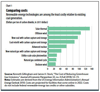My colleague James Stock and I estimated the unsubsidized costs of various technologies to reduce greenhouse gas emissions based on a review of recent economic literature and the Energy Information Administration’s Annual Energy Outlook 2018 (Chart 1). The costs are expressed in relation to existing coal generation, which is a useful benchmark because coal is the most carbon-intensive fuel. In many countries, policymakers will have to decide whether to close existing coal plants on the path toward decarbonization. These estimates are averages from the United States, and one should be cautious in applying them elsewhere.