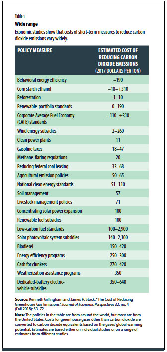 A look at studies in the economics literature reveals an extremely wide range of costs for policies that have been implemented and evaluated (Table 1). At the low end are energy efficiency interventions, which actually save money. In behavioral economics, these are often referred to as “nudges,” because they simply involve providing or reframing information to influence, or nudge, energy-consumption-related decisions toward a more environmentally friendly approach. A well-known example are reports included in electricity bills that compare a household’s electricity use with that of its neighbors. Such interventions are inexpensive and can reduce electricity use by about 2 percent, yielding net savings. While these measures may pay for themselves, the resulting emission reductions tend to be modest and have a relatively small role in deeper decarbonization efforts.