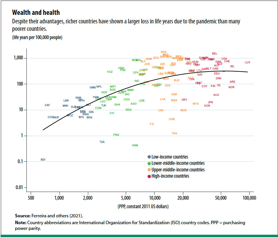 Consider first the global distribution of COVID-19 mortality itself. Using the concept of life years lost to the disease—estimated using ages at death and the residual life expectancies at those ages—we find that the mortality burden of the pandemic is positively correlated with national income per capita, despite the superior health and public prevention systems in rich countries (Ferreira and others 2021). The chart plots the number of years of life lost to the pandemic per 100,000 inhabitants against GDP per capita for 145 countries, using log scales on both axes (see chart, next page).