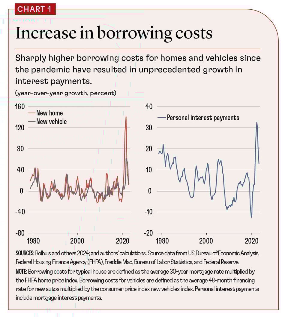 For consumers, the cost of money is part of the cost of living. Thus, as interest rates leapt to 20-year highs in the second half of 2023, consumers felt the financial squeeze. Home prices in the US are still up more than 50 percent since the start of the pandemic, and mortgage rates have roughly doubled. The interest payment on a new 30-year mortgage for the average house is up almost threefold since the end of 2019. The payment on a new car loan has nearly doubled. As a result, households’ interest payments grew by about 30 percent in 2023, the fastest rate on record (see Chart 1).