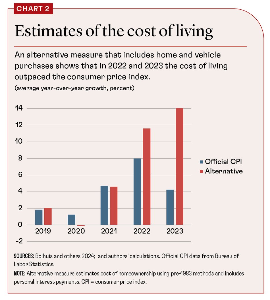 Finally, we present alternative measures of the cost of living that explicitly incorporate the cost of money. The Bureau of Labor Statistics’ current methodology relies solely on the rental market to explain changes in owners’ equivalent rent (Bolhuis, Cramer, and Summers 2022). Before 1983, the CPI included a measure of the cost of homeownership that reflected mortgage rates and home prices. Similarly, the official statistics exclude borrowing costs for vehicles and other personal interest payments (credit card debt, for example) that better reflect actual costs borne by consumers.