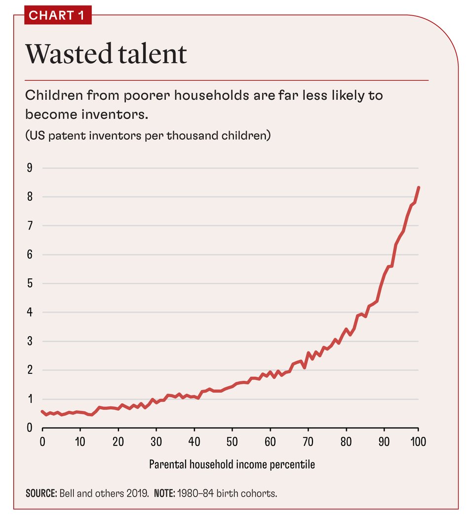 Notwithstanding Plato’s 2,400-year-old proverb, necessity alone is not the mother of invention. It also requires opportunity. An individual’s likelihood of becoming an innovator reflects parental background in terms of income and sociological factors, recent research shows. Highly talented children from disadvantaged backgrounds tend to innovate far below their potential, while children from wealthier or more educated families are much more likely to pursue innovation.