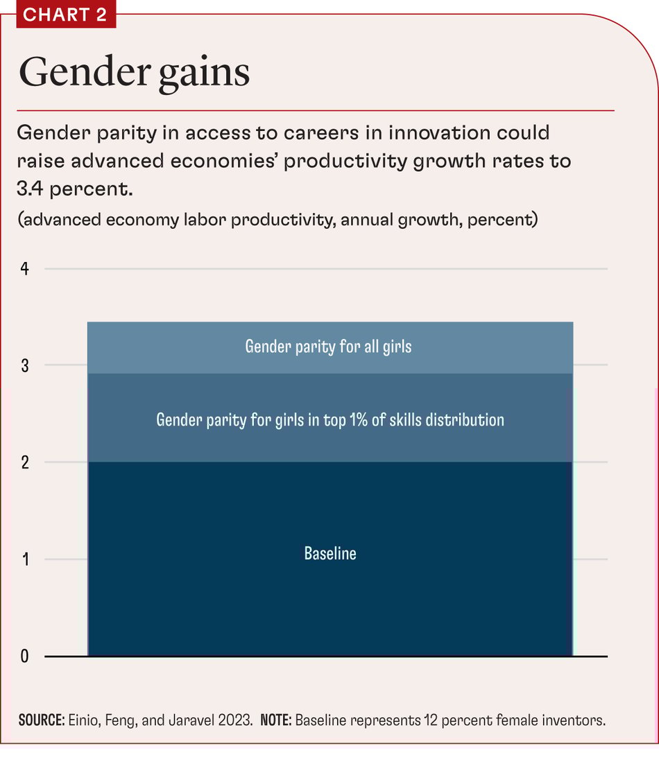 The macroeconomic costs of untapped talent are staggering. A new model that I developed with Elias Einio and Josh Feng (2023) demonstrates that gender parity in access to careers in innovation could boost productivity growth by 70 percent. For high-income countries such as the United States, this would translate into an annual increase in productivity growth of 2.0 to 3.4 percent (Chart 2). Such a substantial gain would have profound implications for both societal welfare and tax revenue. The researchers’ model also shows that bringing the highest-ability children into innovation careers would account for most of the economic gains.