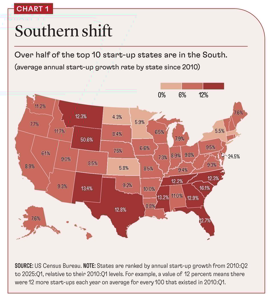 Before the pandemic, there was sizable entrepreneurial activity only in the Western states. That may be changing though. Census data show that 7 of the top 10 states for start-up activity in 2010–25 were in the South, as the map shows.