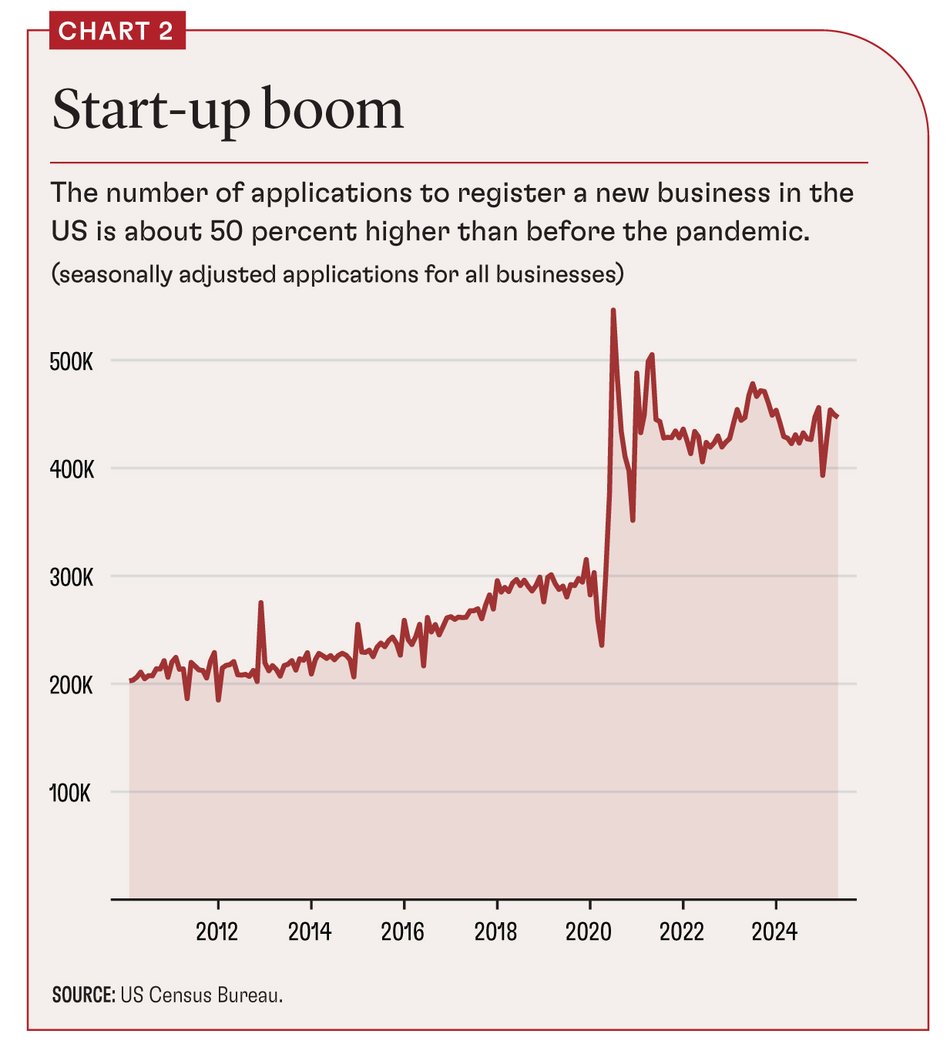 The question is whether all this start-up activity is contributing significantly to job growth. Recent research published by the Federal Reserve suggests that the recent wave of start-ups is less likely than previous upsurges to contribute to employment growth. Young, high-growth start-ups accounted for less than 6 percent of employment in 2024, compared with almost 10 percent in 1985, according to the Fed. AI tech–driven start-ups tend to be capital- and skill-intensive, requiring fewer workers.