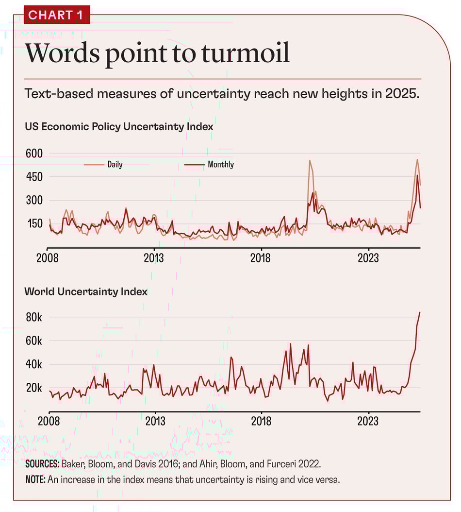 Perhaps the best-known text-based metric is the Economic Policy Uncertainty (EPU) Index developed by Baker, Bloom, and Davis (2016). The index analyzes articles in hundreds of newspapers for mentions of terms related to economics, policy, and uncertainty. This century, the EPU for the United States has typically surged during crises, spiking after events like the 2008 financial crisis and the 2020 COVID pandemic (Chart 1). In 2025, the EPU reached a record high, indicating extensive discussions of uncertainty in national and local newspapers.
