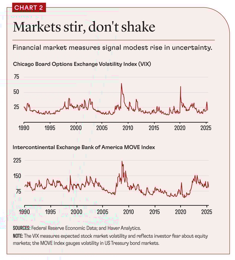 Significant spikes in the VIX over the past three decades occurred around economic and political shocks, such as the Asian and Russian financial crises in 1997 and 1998, the 2008 financial crisis, the 2011 debt ceiling crisis, and the 2020 pandemic (Chart 2). In 2025, the VIX has been elevated—reaching 32 in April—but that was not a large spike compared with previous jumps.