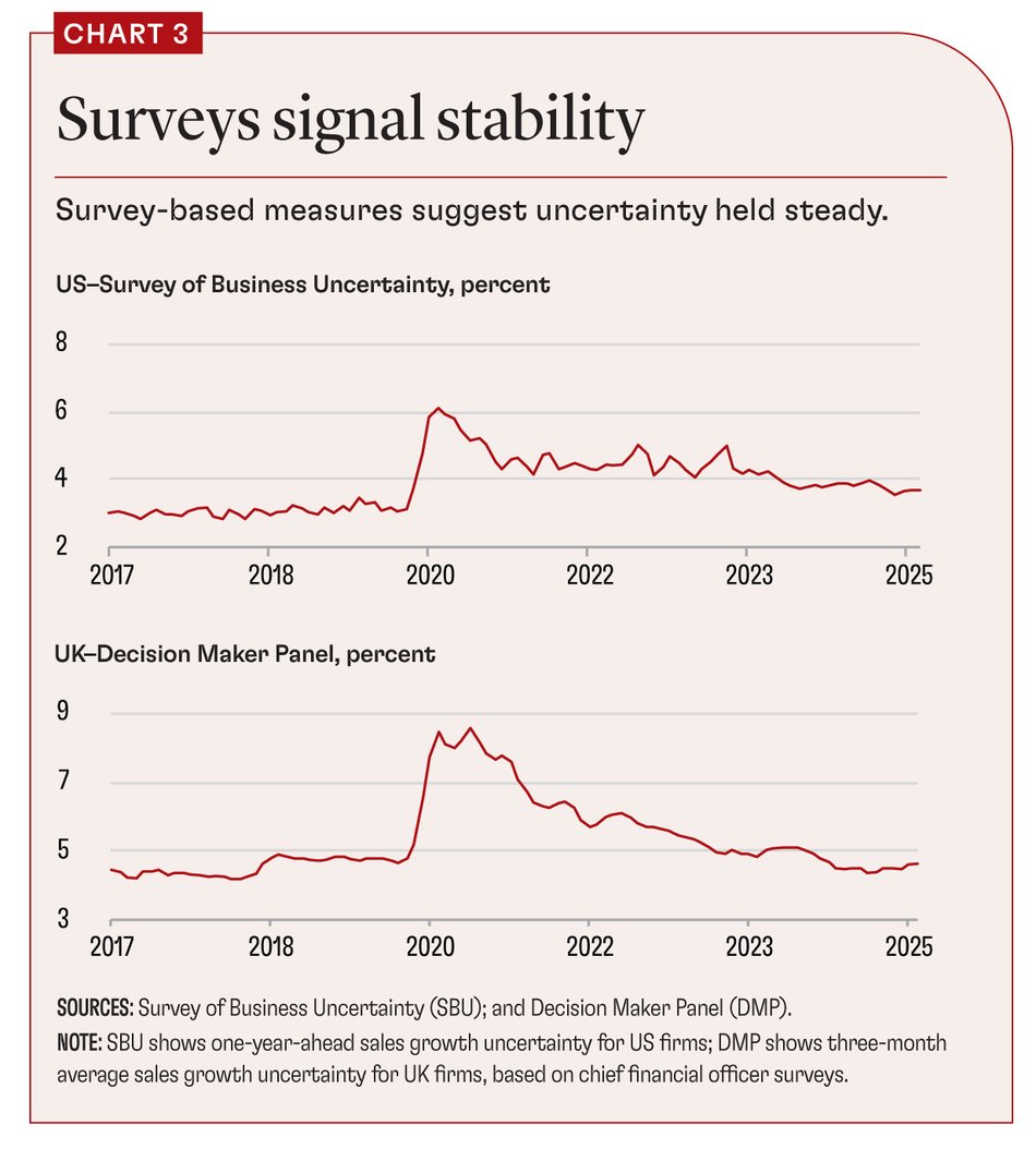 The three main measures rely on textual analysis, financial markets, and business surveys. Text-based measures now show exceptionally high levels of uncertainty. Everything you read, from newspapers to country reports to official publications, seems to discuss uncertainty. Financial-market-based measures, meanwhile, show only moderate levels of uncertainty. And survey-based measures, which spiked during the pandemic, have largely flatlined.