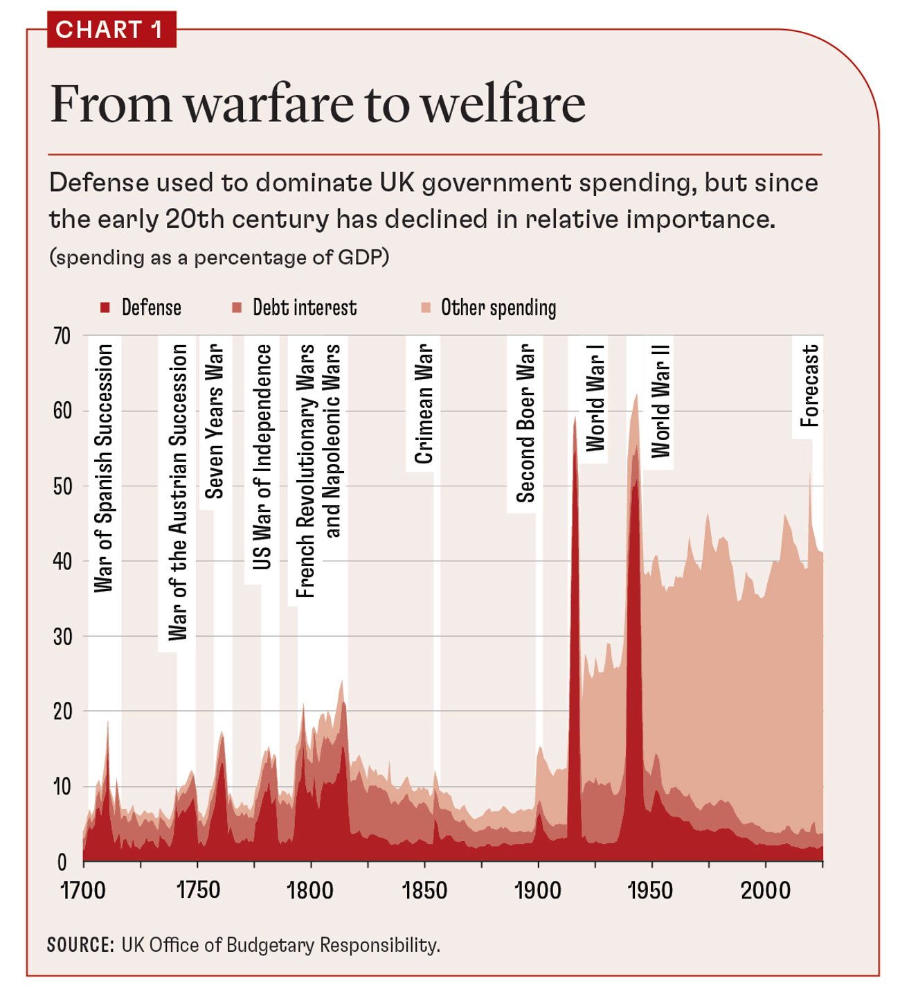 The path from warfare to welfare is clear; until the beginning of the 20th century, warfare and servicing the debt incurred to pay for it, dominated government spending—but rarely exceeded 10 percent of GDP. Today, after more than 70 years of peace, the UK government accounts for about 40 percent of GDP.