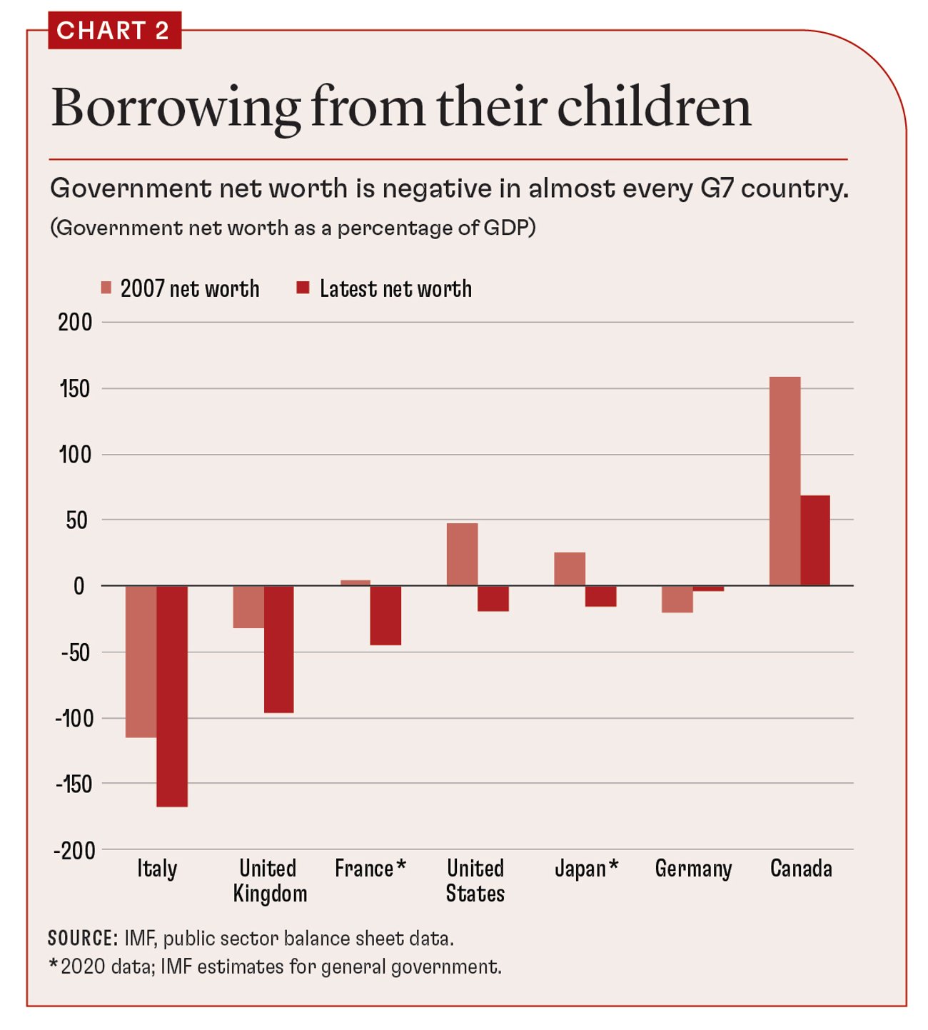 Chart 2 compares general government net worth data for the Group of Seven (G7) countries. It is positive for only one of these, according to the IMF’s latest data, and the picture has deteriorated markedly since the global financial crisis. Despite more than 70 years of peace, the citizens of the other wealthy countries are effectively financing their current lifestyles by borrowing from their children.