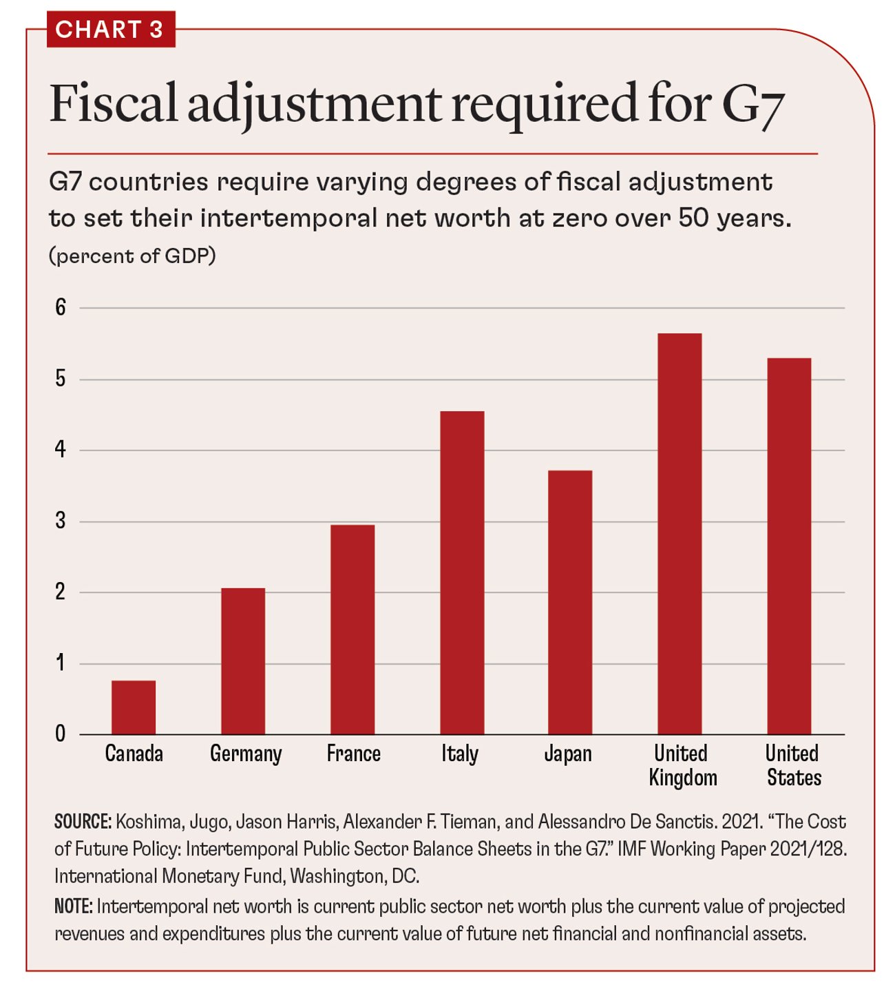 IMF officials have used public sector balance sheet data as a baseline to assess the comprehensive balance sheets of the G7 countries. This assessment be used to derive an estimate of the “fiscal adjustment” (reduction in policy costs or increase in revenues) necessary to meet a given future target. Chart 3 illustrates the adjustment required in each G7 country to set international net worth at zero over the 50-year forecast period. The starting point is 2018 (before the COVID fiscal shocks); however, as an offset to the COVID shocks, the public sector balance sheet data probably understate public sector net worth for the reasons described above.