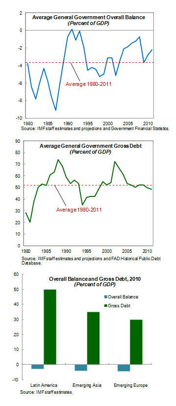 Box 1. Fiscal Developments in Historical Perspective in Latin America While most countries in Latin America have weathered the storm of the global financial crisis, their fiscal position is not particularly strong from an historical perspective nor when compared to other emerging economies. Many countries in the region need to reduce deficits more rapidly and to reorient spending, in order to protect against a sudden reversal of favorable tailwinds and to make room for priority spending. ![]() The fiscal position of Latin American economies is expected to strengthen in 2011, with overall deficits falling to an average of 2½ percent of GDP and debt to about 50 percent of GDP. However, this debt ratio is not much different from its 1980–2010 average; it is also higher than in the mid-1990s, although for many countries vulnerabilities may have declined since then, owing to better debt structures by currency and maturity. Similarly, relative to the position of other emerging economies, overall balances in Latin America are somewhat better, but debt levels are above those of emerging Asia and emerging Europe. A more cautious fiscal policy stance is warranted in the face of ongoing global risks and prospective spending challenges. Revenue performance in some cases has been supported by favorable tailwinds, such as high commodity prices and capital inflows, which could be short-lived. The global low interest rate environment has also helped to contain countries’ interest burdens. In addition, Latin American countries must intensify investment in infrastructure and respond to demographic spending pressures—as health care and pension costs are projected to rise by an estimated 3 percent of GDP on average over the next 20 years, and 7½ percent over the next 40 years. Furthermore, while financial market conditions have improved, large capital inflows and easy credit conditions pose risks to the financial system (through rapid credit growth and excessive risk taking) with potential implications for the budget. |