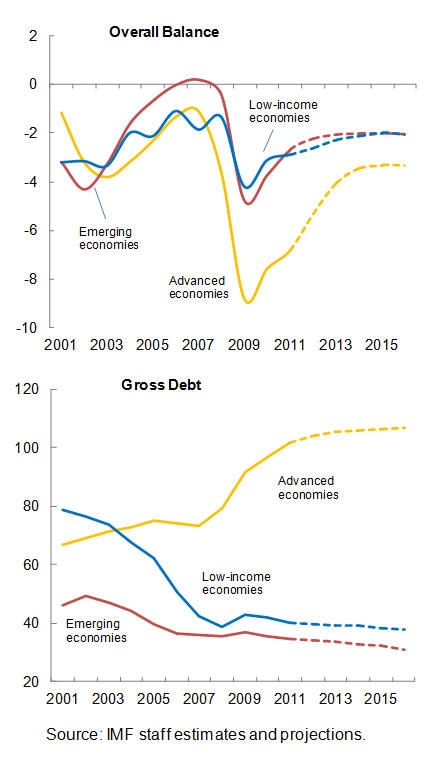 Sources: IMF staff estimates and projections. Note: All country averages are PPP-GDP weighted using 2009 weights. Projections are based on IMF staff assessment of current policies. 1 For overall fiscal balance and cyclically adjusted balance, + indicates a smaller fiscal deficit; for gross debt, + indicates a larger debt. 2 Excluding financial sector support recorded above the line. |