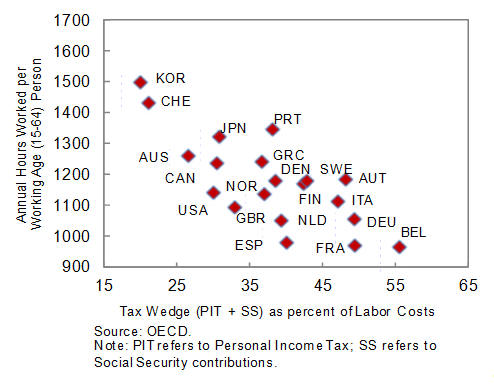 However, in prominent adjustment cases in Europe—notably, Greece and Portugal—downward revisions to growth (and, in the case of Portugal, revisions to the fiscal accounts to include state-owned enterprises) have, in the presence of financing constraints, implied the need for further fiscal adjustment measures. (Recently undertaken measures in these and a few other European economies with IMF-supported programs are summarized in Table 2.) Nevertheless, the Portuguese authorities’ program now envisages attaining a deficit of 3 percent of GDP only in 2013, a year later than under the authorities’ original stability program, thus avoiding an excessively sharp fiscal contraction. In addition, a notable objective of the Portuguese program is to improve international competitiveness and employment by shifting the weight of taxation from labor to domestic consumption (the so-called “fiscal devaluation”). (Recently released data from the Organization for Economic Cooperation and Development (OECD) confirm a strong cross-country association between the labor tax wedge and hours worked per person of working age—Figure 2.) In Greece, further fiscal adjustment is planned to reduce the general government deficit from 10.4 percent of GDP in 2010 to 7.5 percent in 2011, thereby maintaining the government’s fiscal targets for 2011 and the medium term.
