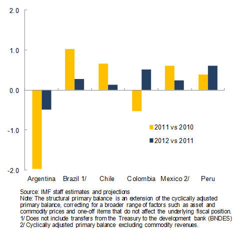 In many Latin American economies, the overall fiscal balance is projected to improve in 2011 compared with 2010, but the fiscal position is not particularly strong from an historical perspective (Box 1). The fiscal stance is broadly in line with medium-term-oriented fiscal rules. Other than in Chile, these rules are for the most part not defined in cyclically-adjusted terms. In most cases, more could be done to dampen overheating pressures (Figure 3). In Brazil, where the debt ratio remains high by emerging market standards, fiscal outturns through April indicate that stimulus withdrawal is on track to meet the 3 percent of GDP primary surplus target in 2011, while treasury lending to Brazil’s National Development Bank is being reduced. A slight downward revision to the overall balance largely reflects a higher projected interest bill. In Mexico, fiscal consolidation is underway, driven by spending restraint and stronger revenues stemming from solid economic growth and high oil prices; from 2012 onward, compliance with the balanced-budget rule would ensure that the public debt/GDP ratio is gradually reduced. In Colombia, the government is expected to increase spending on infrastructure and reconstruction projects after major floods last year, which will be offset by higher tax revenues as growth remains firm. Meanwhile, the establishment of a fiscal rule is currently under discussion in Congress. In Peru, the fiscal deficit is expected to stay in line with the 0.5 percent of GDP target under the fiscal responsibility law. Overall, as revenues remain buoyant and inflation expectations continue rising, these countries would benefit from over-performing with respect to their fiscal goals to help contain domestic demand pressures and increase fiscal savings. This is especially true given that revenue gains associated with strong capital inflows and commodity prices could prove temporary. Consideration should be given to redefining fiscal rules on cyclically-adjusted targets, to discourage pro-cyclicality of fiscal policies.