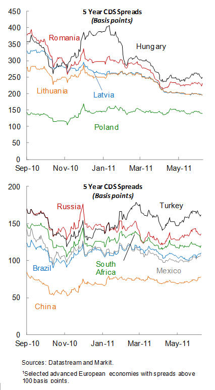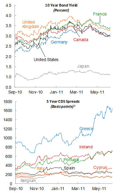 Despite political events in the Middle East and North Africa, natural disasters, and the announcement in April of Standard and Poor’s negative outlook for the sovereign credit ratings of the United States and Japan, government bond yields in the largest advanced economies remain at very low levels, providing little incentive to reduce deficits (Figure 4; see also Global Financial Stability Report Update, June 2011). The announcement of negative outlooks for Belgium and Italy in May had a somewhat larger impact, but credit default swap (CDS) spreads later returned to their previous levels. Likewise, emerging economies’ spreads have been stable.