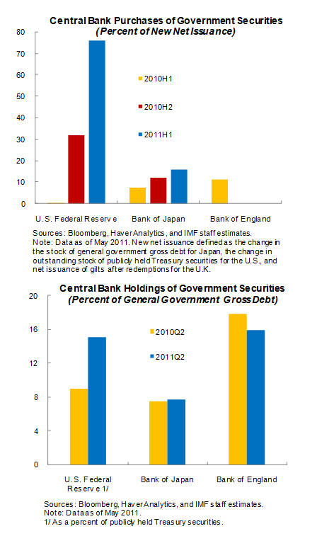 Some central banks in the largest advanced economies have continued purchasing government securities as announced, acquiring a significant share of government debt. Purchases of government bonds by the U.S. Federal Reserve since end-2010 have amounted to US$500 billion—with total envisaged asset purchases of US$600 billion under the second round of quantitative easing slated to end in June—bringing its holdings to 15 percent of publicly-held government debt. Securities purchases by the Bank of Japan (BOJ) are continuing. The BOJ now holds 7½ percent of outstanding government debt. Meanwhile, there have been no further market interventions by the ECB since March; its holdings of government securities remain equivalent to 11 percent of the outstanding debt of Greece, Ireland, and Portugal. In contrast, the Bank of England essentially halted its net purchases of government debt about a year ago, though its stock of holdings still stands at 16 percent of outstanding U.K. sovereign debt. Although unwinding these large portfolios of government debt could present challenges in an environment of still-sizable sovereign financing requirements, central banks may well opt to hold to maturity a substantial portion of their government debt holdings.