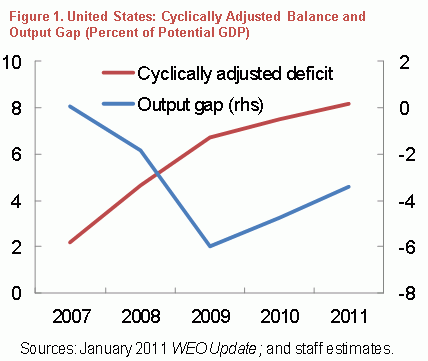 - The U.S. Congress approved a stimulus package in December featuring income and payroll tax cuts and extended unemployment benefits (Table 2). While some targeted measures to address the weak state of labor and housing markets are justifiable, the package’s composition means that its stimulative impact will be small, relative to its fiscal cost (see January 2011 WEO Update). Combined with the better-than-expected 2010 outturn, the new measures mean that the deficit is expected to increase slightly this year, compared to the decline of 1½ percent of GDP forecast in November. The United States will be the only major advanced economy implementing procyclical fiscal policies this year, albeit in the face of a still-sizable output gap (Figure 1). Moreover, getting on track to achieve the Toronto Declaration commitment to halve the deficit by 2013 will require a significant adjustment next year. In this respect, the 2012 deficit forecast is consistent with the targets spelled out in the recent mid-session budget review. Furthermore, progress on developing a medium-term consolidation plan has been slow: the final report of the President’s Fiscal Commission succeeded in laying out a comprehensive strategy of discretionary spending cuts and tax and entitlement reforms but failed to garner the supermajority support needed to formally submit its report to Congress.