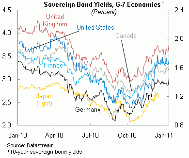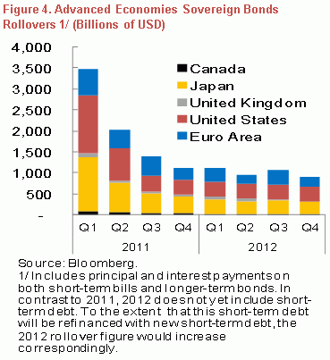 Large rollover needs for public and private sector debt are projected for 2011. Pressures will be especially high during the first half of the year, with euro-area countries competing with about $5 trillion in sovereign rollover needs in other advanced economies (Figure 4). This will be compounded by large funding requirements from financial groups in many countries (see January 2011 GFSR Update).