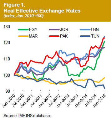 In 2014, economic activity was weighed down by disappointing export growth, security concerns, and unresolved supply-side bottlenecks. Exports were adversely affected by weak euro area growth (the Maghreb’s key trading partner) and deteriorating competitiveness. Real exchange rates appreciated (Figure 1) as nominal exchange rates appreciated against the euro, on the back of a strengthening U.S. dollar, against which some countries peg their currencies. Security risks discouraged tourism (Egypt, Lebanon) and coupled with spillovers from regional conflicts (Iraq, Libya, Gaza, Syria) hurt confidence. Developments in Iraq and Syria also resulted in large refugee flows and trade disruptions in Jordan and Lebanon and exacerbated the political impasse in Lebanon. Electricity supply disruptions (Egypt, Lebanon, Pakistan) and limited access to bank credit added to headwinds from weak confidence, taking a toll on private sector sentiment. Lower oil prices, due to their appearance late in the year and slow passthrough to local fuel prices, had little effect on reducing production costs and increasing disposable incomes.