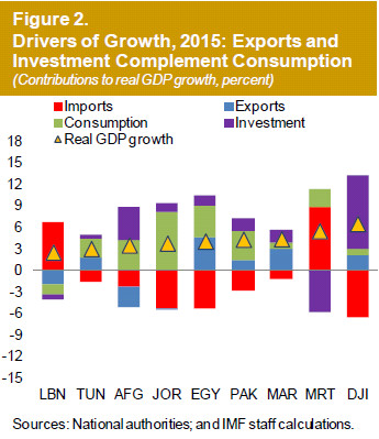 Economic growth is projected to strengthen by 1 pp to 4 percent in 2015 (Figure 2). Exports are anticipated to rise in line with the gradual recovery expected in the euro area. Domestic demand growth is also likely to pick up owing to already initiated monetary easing (Jordan, Morocco), less drag from fiscal consolidation, and increased government spending on growth-enhancing investment in infrastructure, health, and education. Signs of improving confidence have emerged, including falling risk premiums, stock market gains, and a pick-up in credit growth. Confidence is also benefitting from last year’s advances in political transitions, through elections and new constitutions. Many governments—now backed by multiyear horizons—are undertaking difficult structural reforms. These should help reduce supplyside impediments (including energy shortages), further supporting investment and exports, and countering real exchange rate appreciation pressures. Lower oil prices are likely to support confidence by helping ease fiscal and external vulnerabilities. However, given the limited pass through to retail prices across the region as a whole, its direct impact on growth may be modest and offset by intensifying security risks and spillovers from conflicts. Consumption will continue being supported by remittance inflows, public wage spending, and, in some cases, subsidies.