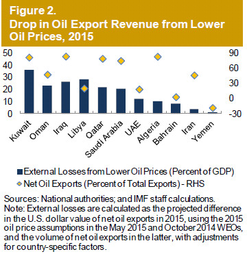 Under the current oil price assumptions, the fall in anticipated oil export earnings in 2015 is $287 billion (21 percent of GDP) in the GCC and $90 billion (11 percent of GDP) in the non-GCC countries (Figure 2). The oil price decline will turn the longstanding current account surplus of MENAP oil exporters into a deficit of $22 billion (1 percent of GDP) in 2015.